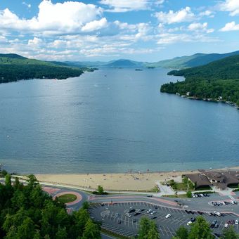 Million Dollar Beach se extiende por la orilla del lago George con una amplia zona arenosa y vistas montañosas, con zonas de natación vigiladas.