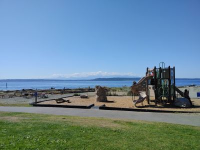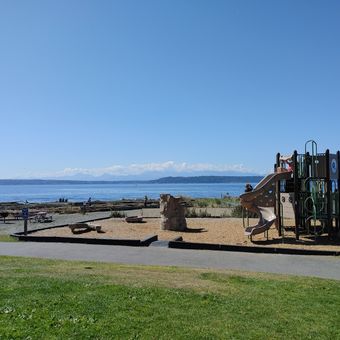 Marina Beach se extiende a lo largo de Puget Sound con vistas a las Montañas Olímpicas, con una costa arenosa y mesas de picnic.