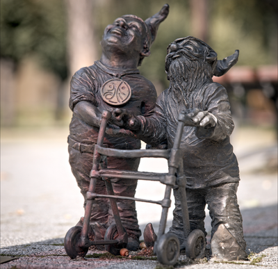 Diakonki, Estatua de gnomo en bronce en el distrito Pilczyce-Kozanów-Popowice Północne, Wrocław, Polonia.