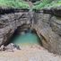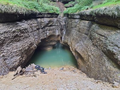 Durante las lluvias intensas, el caudal del manantial aumenta notablemente, mientras que en sequía revela una profunda cavidad en la caliza.