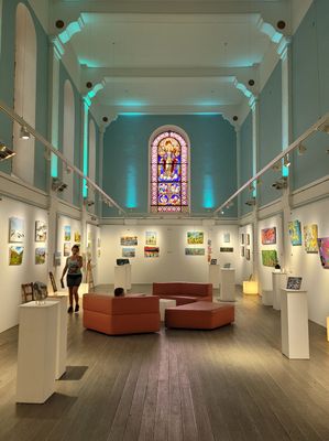 El espacio mantiene sus elementos arquitectónicos originales, incluyendo vidrieras, mientras funciona como galería de arte contemporáneo de 20 metros de largo.