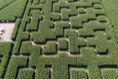El laberinto contiene juegos de madera a lo largo de sus cinco kilómetros de senderos distribuidos en cuatro hectáreas de campos de maíz.