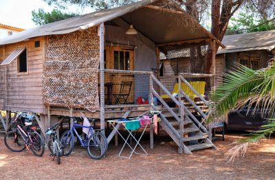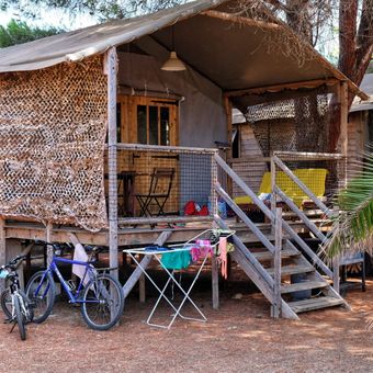 El camping de 5 hectáreas cubierto de pinos se extiende por suaves pendientes, con 150 parcelas y 37 bungalós cerca de la playa Tenutella.