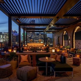 Spaceman es una terraza en la azotea en el piso quince del Hyatt Centric Buckhead con vistas sin obstáculos de la línea del horizonte y los barrios circundantes. El espacio abierto cuenta con paneles de vidrio de piso a techo que enmarcan el panorama y crean un ambiente luminoso y aireado.