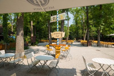 El jardín sirve cerveza Hofbräu München junto con especialidades bávaras como Hendl, Ochsensemmel y untables de queso tradicionales.