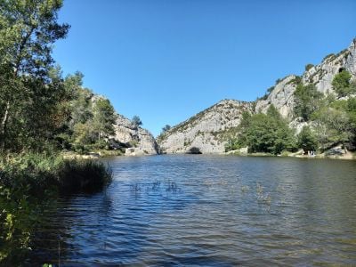 El lago Peirou, ubicado en las montañas Alpilles, termina con una presa que conecta dos acantilados y ofrece senderos en un entorno natural protegido.