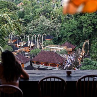 Este establecimiento gastronómico elevado cuenta con una terraza al aire libre que ofrece vistas panorámicas de los arrozales y las colinas cubiertas de selva que rodean Ubud.