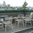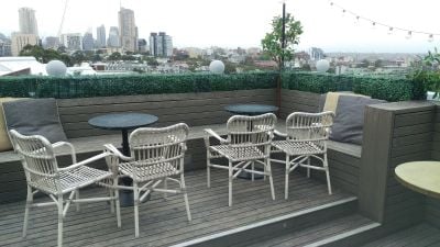 La terraza en azotea cuenta con sillas de estilo antiguo, mesas redondas, setos verdes, calentadores y faroles colgantes que crean un ambiente de jardín inglés mientras proporciona amplias vistas urbanas de Sídney.
