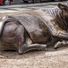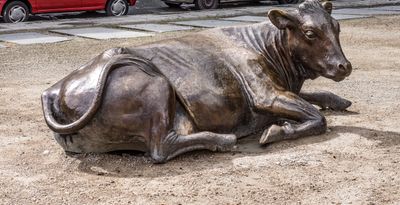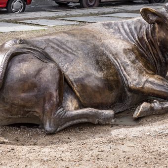 Esta escultura de bronce de tamaño natural representa una vaca en posición recostada, que parece disfrutar del calor de la luz solar en un momento de tranquilo descanso.