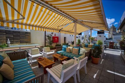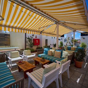 The Mint Roof presenta una decoración colorida diseñada por Jaime Beriestain, combinando sofás cómodos con vegetación exuberante para crear un ambiente relajado en la terraza exterior sobre la ciudad.