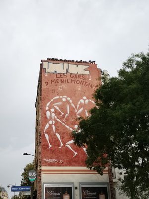Este mural de Jérôme Mesnager, creado en 1995, muestra formas humanas blancas, simples y largas que se mueven sobre un fondo rojo. Encima, hay texto escrito a mano que dice "Les gars d'Ménilmontant" y bloques pálidos son visibles.