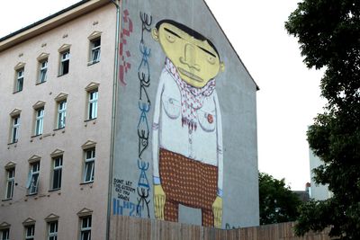 Os Gêmeos incorpora folclore brasileño e imágenes surrealistas en sus diseños distintivos de personajes amarillos, convirtiendo esta obra en un marcador cultural significativo en la escena artística internacional de Berlín.