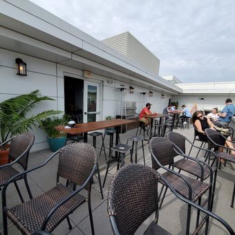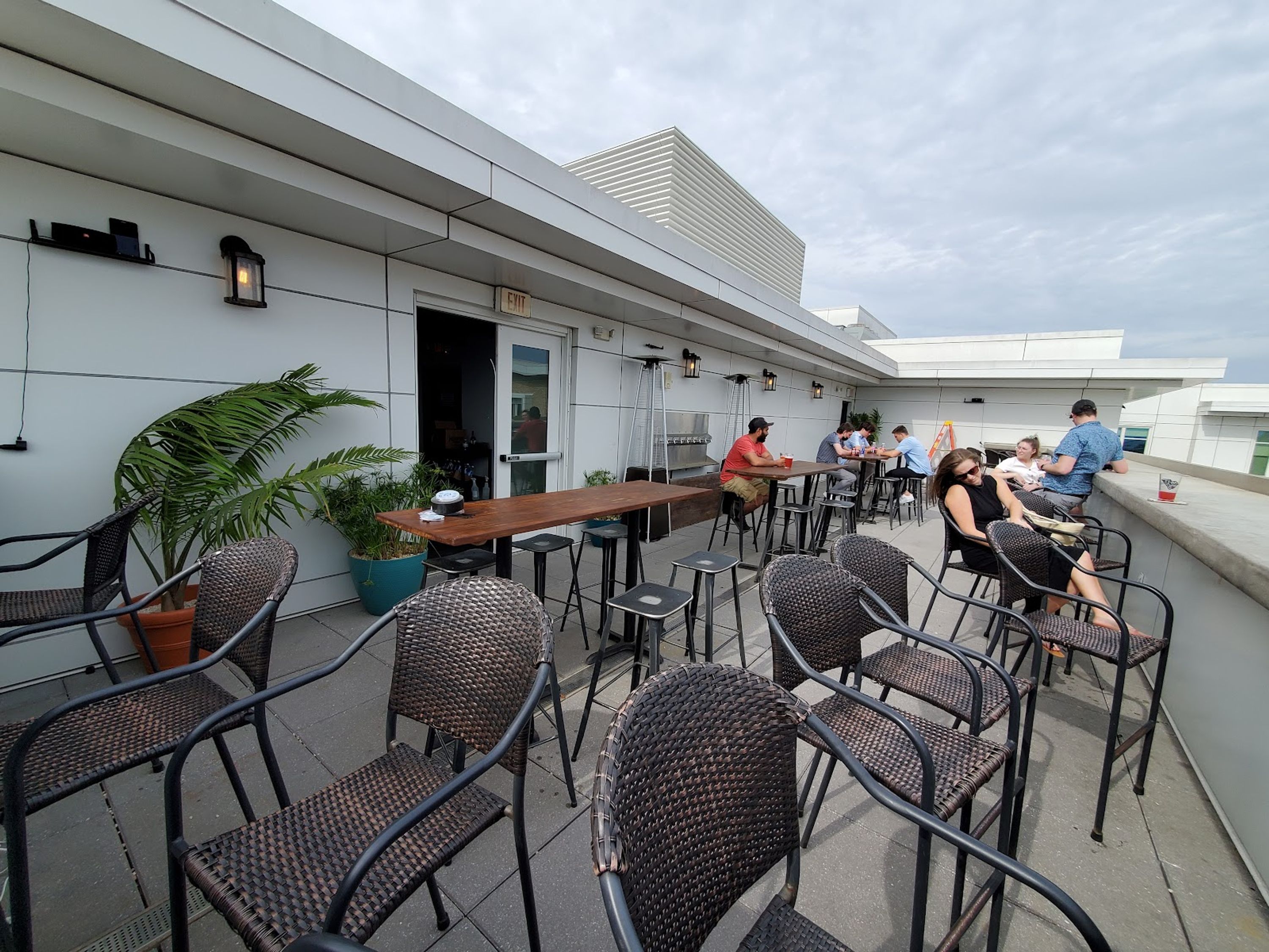 Esta terraza panorámica en el noveno piso del Hyatt House Charleston ofrece vistas del centro de la ciudad y cuenta con un sistema de autoservicio con más de 70 grifos de cervezas artesanales, sidras, vinos y cócteles.