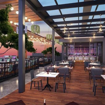 Este establecimiento ubicado en una azotea cuenta con una terraza al aire libre que sirve cocina diversa incluyendo sushi, tapas y platos principales, complementados con una amplia selección de champanes, vinos y cócteles exclusivos mientras ofrece vistas panorámicas del horizonte de Johannesburgo.