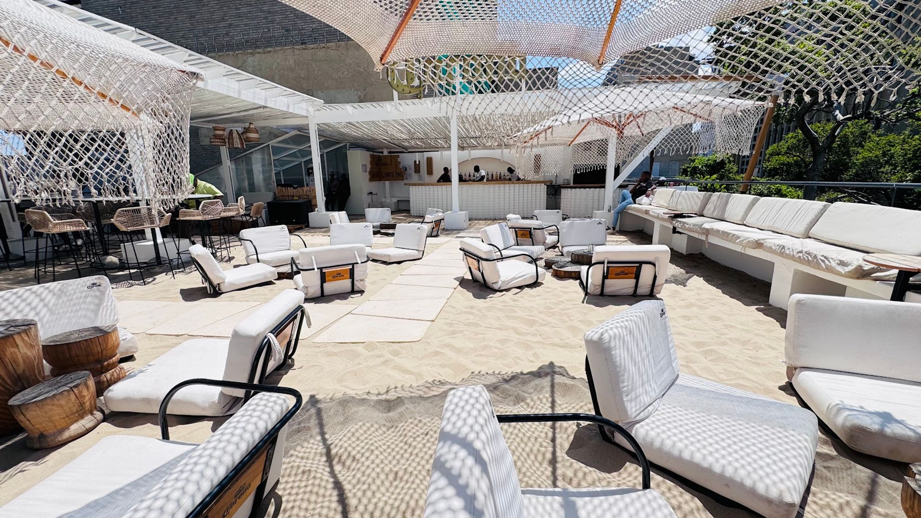 Los huéspedes pueden caminar descalzos sobre arena real mientras disfrutan cócteles y vistas de la ciudad, creando una sensación costera inusual en Johannesburgo sin costa.