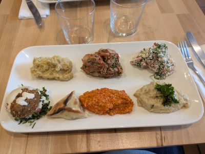 El restaurante funciona de lunes a sábado de 10:30 a 21:00, ofrece shawarmas con precios entre 15-16 euros y sirve brunch dominical por 20-22 euros cerca de la estación Convention.