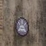 El mosaico representa una figura alienígena blanca con patas y brazos rectos, sobre un fondo circular de azulejos morados con borde negro alrededor del diseño.