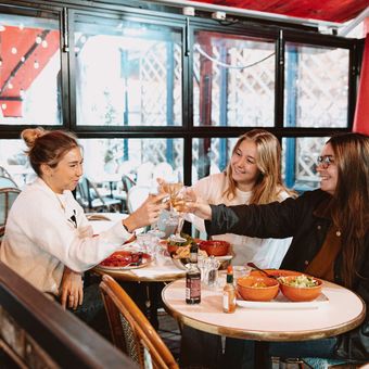 La terraza exterior permite a los comensales disfrutar de comidas al aire libre durante el clima favorable, creando una experiencia gastronómica distintiva en uno de los barrios más deseables de París.