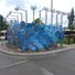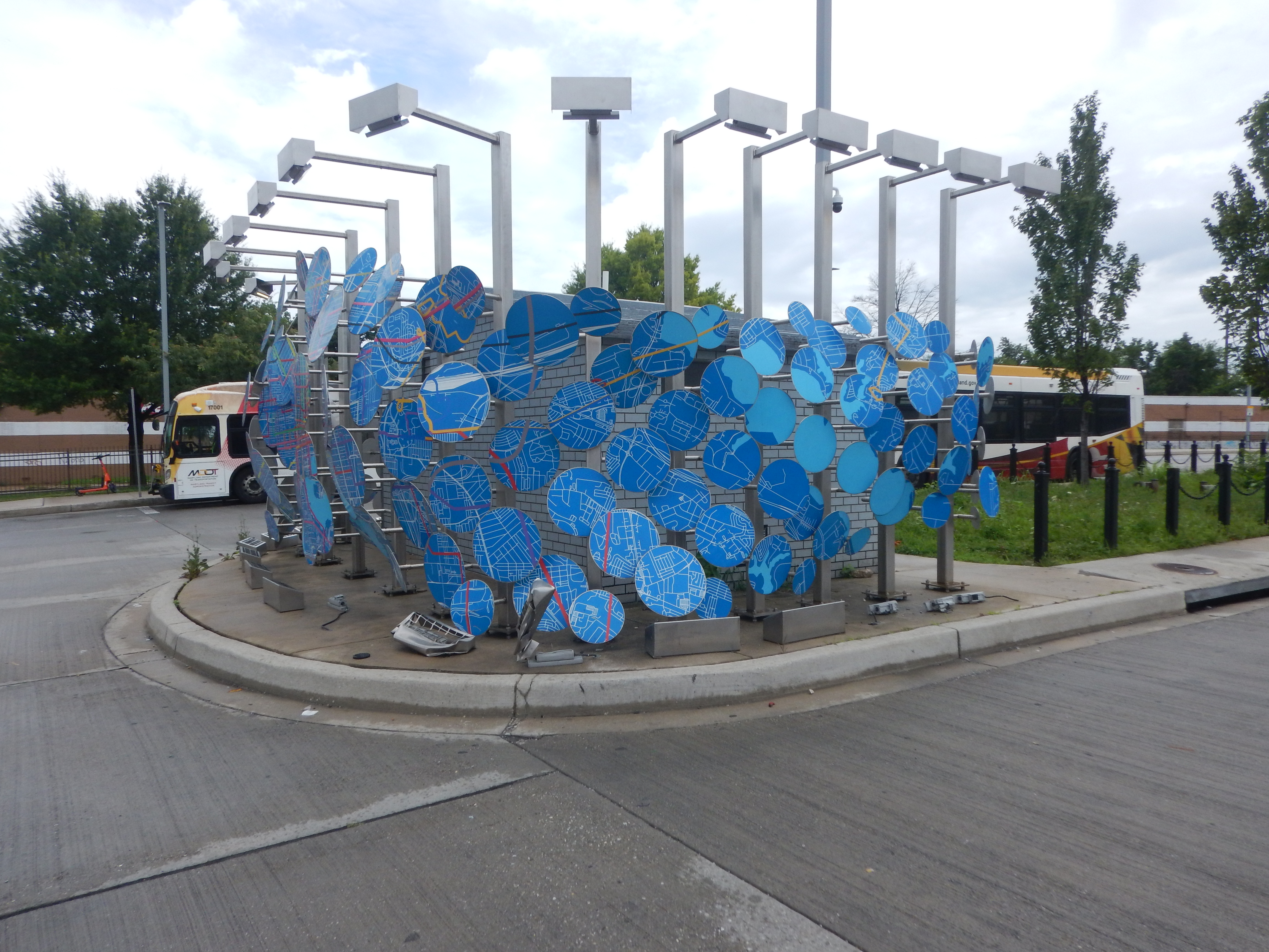 Artwork portrays deconstructed street map of Baltimore. Forms series of panels around bus operator restrooms.