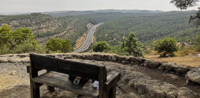 נקודת תצפית על שער הגיא עם ספסל שמשקיפה על כביש 1 ועל הרכס שמצפונו שכולל משלטים נוספים