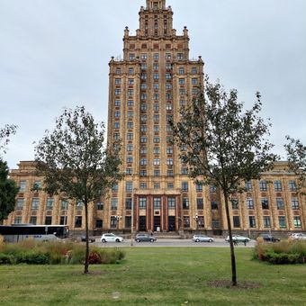 El edificio fue completado en 1961 durante la era soviética y sirvió como símbolo de modernización, presentando arquitectura del Clasicismo Socialista que una vez estuvo adornada con símbolos comunistas.