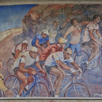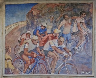 Runners, painting in the Arcumeggia open-air mural gallery, Casalzuigno, Italy, by Aligi Sassu, 1957