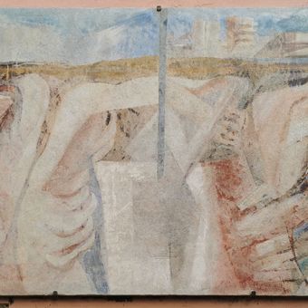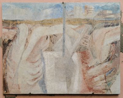 Due crocifissi a mezza figura, 1964 painting in the Arcumeggia open-air mural gallery, Casalzuigno, Italy, by Gianfranco Goberti