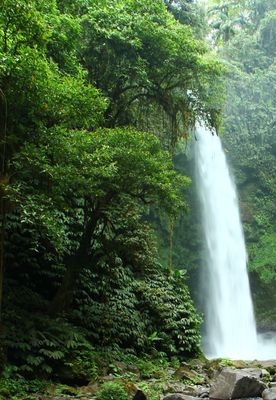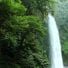 La Cascada Nungnung es una caída de agua en Badung, Bali, que desciende aproximadamente 50 metros y está rodeada de densa vegetación selvática. El agua fluye con potencia hacia un estanque transparente en su base, con paredes de roca cubiertas de musgo enmarcan toda la escena.