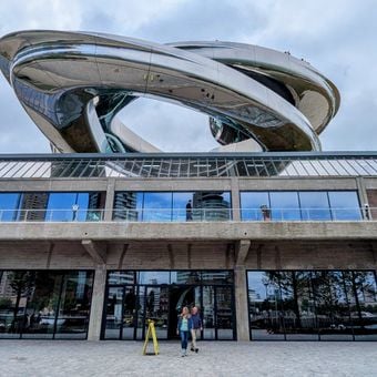 Una terraza en la azotea se encuentra en la parte superior del museo y ofrece vistas sobre el puerto y el horizonte de Róterdam. Este espacio al aire libre conecta las historias interiores con el presente vivo de la ciudad y proporciona una vista amplia del agua y los barcos que entran y salen.