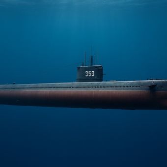 El Changcheng 353 es un submarino que ahora funciona como barco museo en el Parque Temático Binhai de Tianjin. La embarcación mide aproximadamente 76 metros de largo con un casco gris oscuro y cuenta con tubos de torpedos en la proa y la popa, junto con tuberías complejas visibles y escotillas en su exterior.