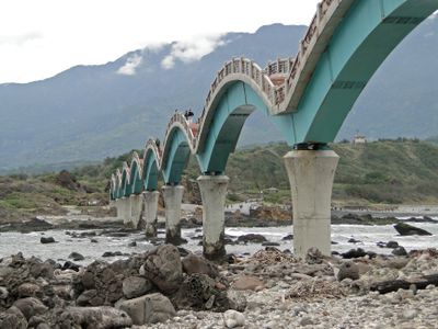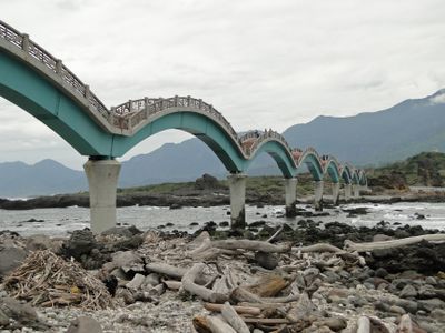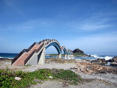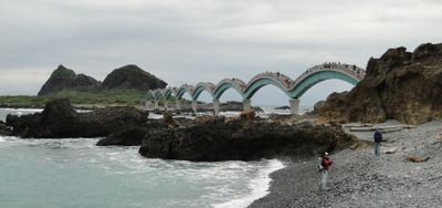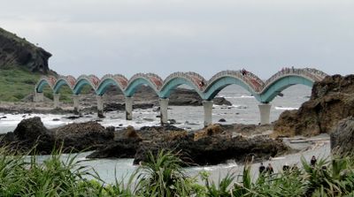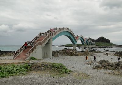 El Puente del Arco de Sanxiantai es un paso de piedra con ocho arcos que conecta tierra firme con una pequeña isla en la costa este de Taiwán. La estructura atraviesa el agua con arcos espaciados regularmente, dando acceso a senderos, cuevas, un faro de la era japonesa y áreas de costa rocosa alrededor de la isla.