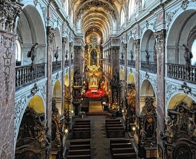 Fundada en 1232 por el Rey Wenceslao I, la iglesia sobrevivió las guerras husitas pero sufrió daños durante el incendio de 1689.