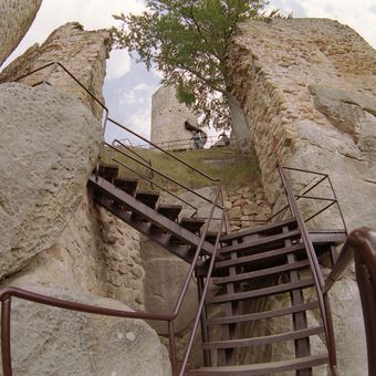 El castillo se alza sobre el valle del río Jizera, con una torre de vigilancia principal y estructuras defensivas talladas en rocas de arenisca.