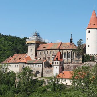 El castillo de Křivoklát es una fortaleza de piedra en una colina boscosa de Bohemia central, rodeada de torres cilíndricas y angulares conectadas por muros defensivos. En su interior hay una capilla con bóvedas góticas, un salón ceremonial grande, habitaciones residenciales y una torre alta con vistas al bosque circundante.