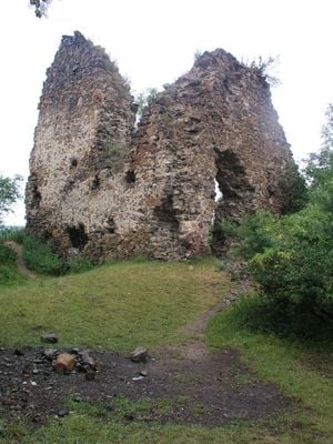 Los restos del castillo Týřov se alzan sobre un promontorio sobre el río Berounka, con muros perimetrales conservados y una torre defensiva.