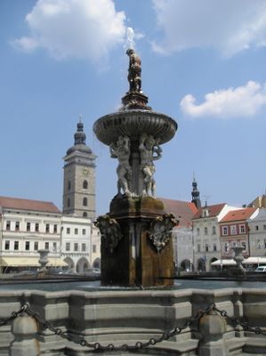 La fuente funciona como punto central de encuentro en České Budějovice y ayuda a orientarse en el distrito histórico.