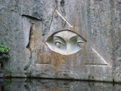 La escultura utiliza la superficie del agua de la cantera para reflejar los ojos tallados, creando un efecto de duplicación. Esta interacción con el reflejo hace que la obra se fusione con su entorno de manera sutil y llamativa.