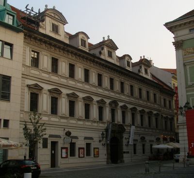 El palacio se compone de dos edificios góticos unidos, con tallas elaboradas y elementos decorativos en su fachada principal en Ovocný trh.