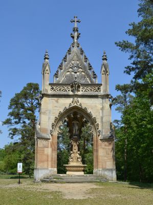 La Capilla de San Huberto es un lugar de culto neogótico en la Paisaje Cultural de Lednice-Valtice, caracterizado por una forma triangular, tres arcos góticos y construcción de piedra arenisca. La bóveda muestra nervaduras que definen la estructura interior.