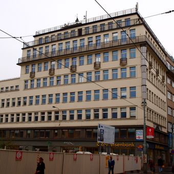 La librería Aventinum ocupaba las plantas baja y primera, con interiores diseñados por Bedřich Feuerstein del grupo artístico Devětsil.