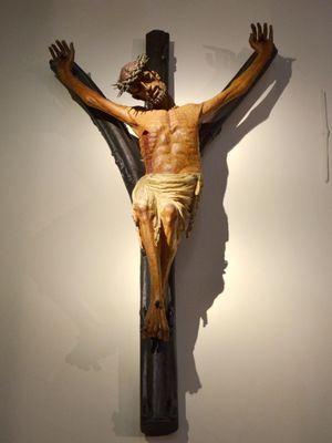 La figura combina detalles anatómicos precisos con una cabeza desproporcionadamente grande, representando una transición en las representaciones de Cristo.