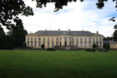El Castillo de Nové Hrady es una estructura neoclásica ubicada en terreno elevado con detalles ornamentales en su fachada y ventanas altas. El edificio domina un parque de paisaje inglés y exhibe las proporciones equilibradas típicas de su época arquitectónica.