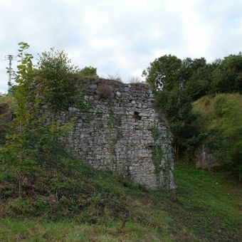 Los restos de piedra del castillo se alzan sobre un acantilado calizo sobre el valle del río Berounka, con una torre cuadrada y partes de muros.