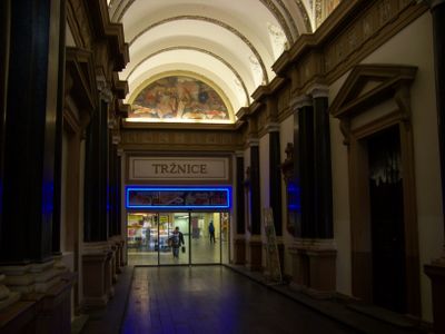 La entrada principal por la calle Rytířská muestra una fachada neorrenacentista decorada con motivos de los mercados tradicionales de Praga.