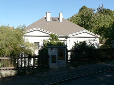 La villa de dos pisos presenta tres ejes de ventanas en todas las fachadas y muestra frontones triangulares con elementos en relieve.