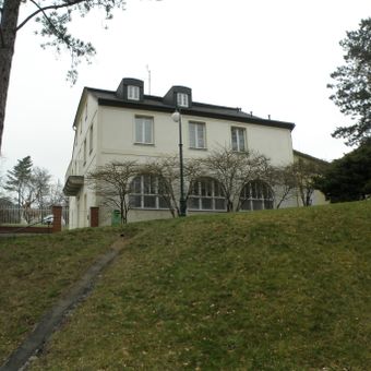 El edificio de piedra presenta elementos arquitectónicos checos tradicionales con una fachada simétrica, ventanas grandes y molduras decorativas.
