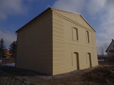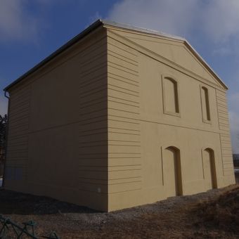 La estructura minera presenta un edificio de pozo de mampostería de piedra con esquinas rústicas, ventanas y un tejado bajo a dos aguas.