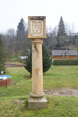Column shrine in Bartošovice v Orlických horách, svatý obrázek (boží muka) u křižovatky u kostela, mezi čp. 31 a 32