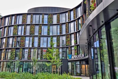 El AFI Karlin Butterfly presenta dos alas conectadas con fachadas que contienen 40,000 plantas en macetas y paneles metálicos para eficiencia energética.