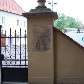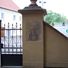 Plaque on the cemetery gate of Church of Saint James the Greater, plaque in Kunratice